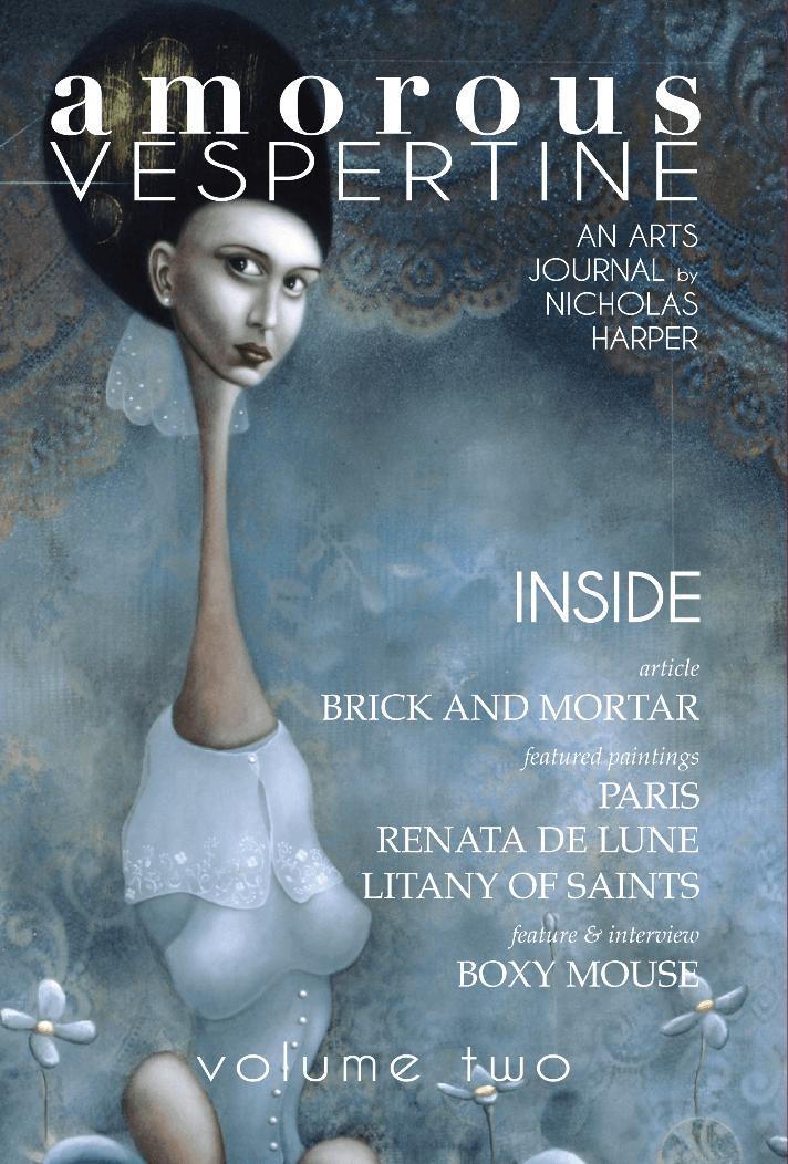 Amorous Vespertine is an arts journal dedicated to the preservation of the printed page and the art journal as artifact. Each issue is a menagerie of images, essays and interviews. In particular, you'll find key signature works by Nicholas Harper along with brief essays on the thoughts and ideas underlying each piece. Each issue also features an artist interview with gallery artists accompanied by images of their work.