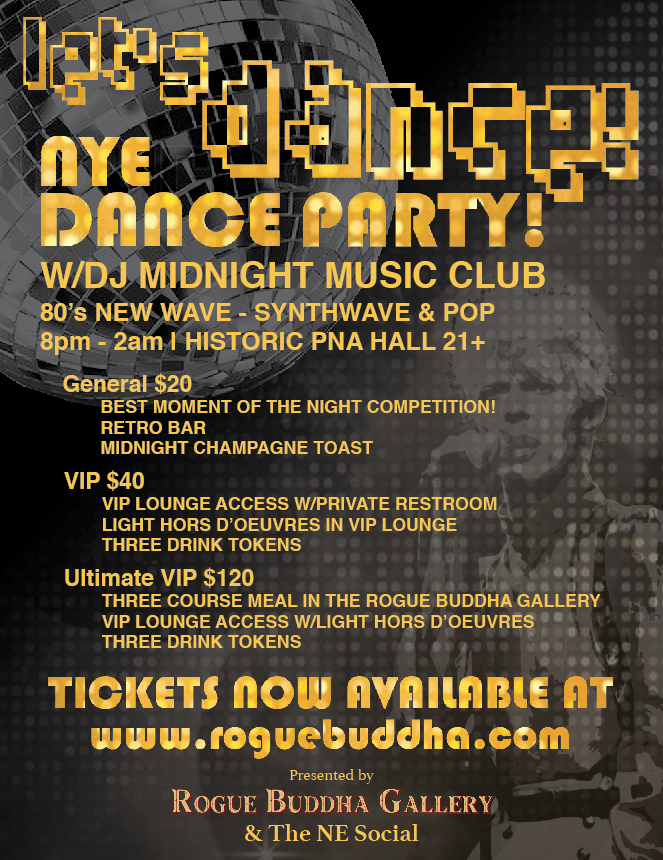 Make your NYE extra special and be one of only 20 people to partake in this exceptional dinner! In addition to light appetizers, NE Social Executive Chef, Joshua Lindquist and Sous Chef, Tommy Vu, have curated a special three-course meal featuring a starter, main course (meat or veggie) and dessert. Enjoy complimentary wine as you dine in fine style under the dimmed lights of the Rogue Buddha Gallery. After dinner, make your way upstairs to the PNA Hall where your private lounge awaits, as does the dance floor!